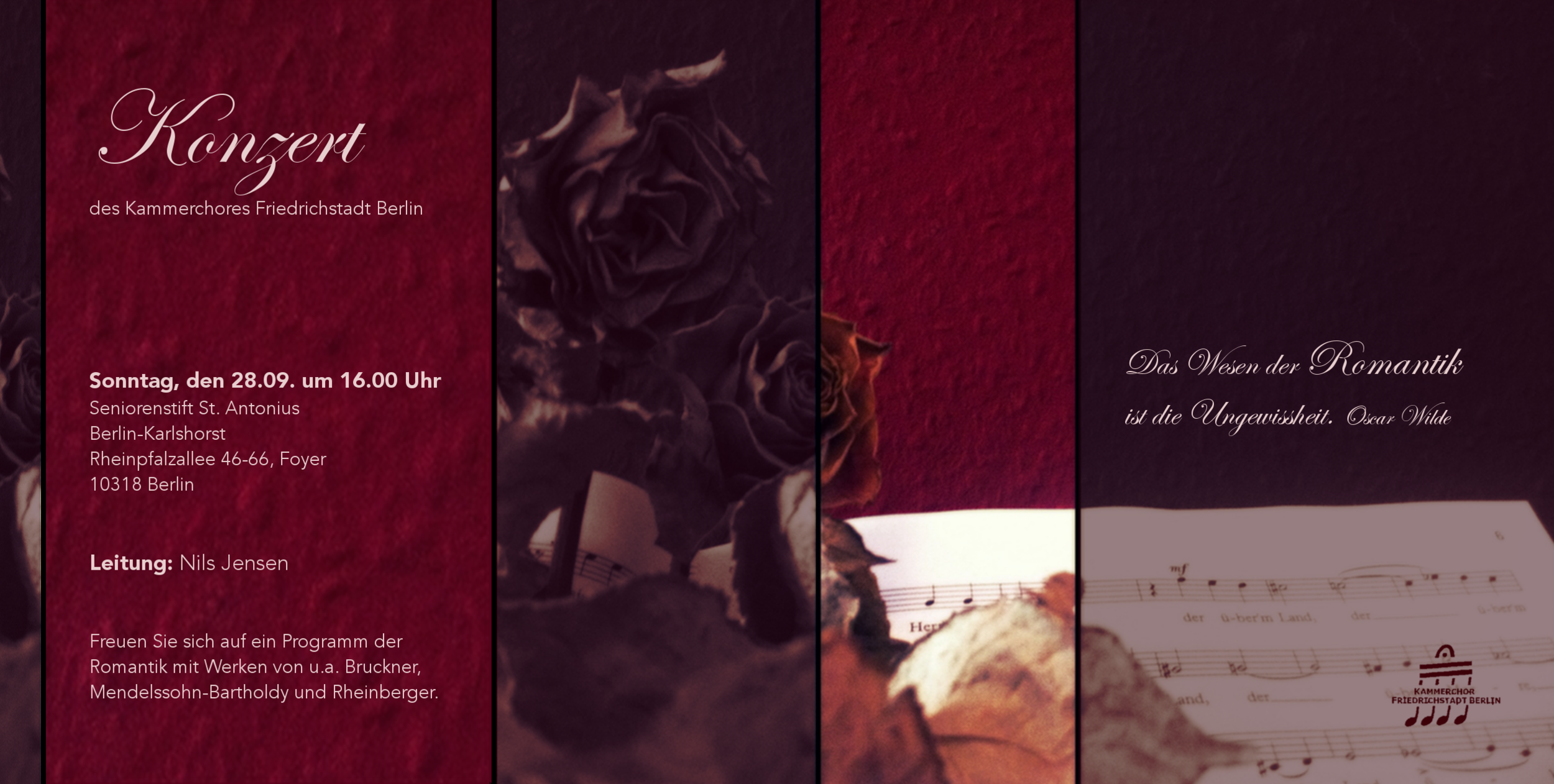 Am Sonntag singen wir ein Romantik-Konzert im Seniorenstift St. Antonius in Karlshorst. Auch junge Leute und Externe sind willkommen! - Ich freue mich drauf, die Herzen der Menschen dort zu berühren und ihnen schöne Momente zu schenken.